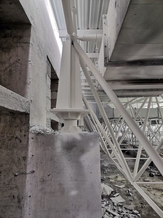 現(xiàn)場施工人員從工程特點(diǎn)、施工程序、施工工藝、施工技術(shù)等方面作了詳細(xì)講解,雙方就關(guān)鍵技術(shù)點(diǎn)進(jìn)行了全方位技術(shù)交流。該網(wǎng)架結(jié)構(gòu)采用網(wǎng)架桿件、螺栓球等網(wǎng)架材料,整體網(wǎng)架尺寸為39x42米,重量約69.5噸,吊裝提升高度約14.9米。根據(jù)該網(wǎng)架的特點(diǎn),選用高空散裝方法安裝,將網(wǎng)架分為幾個單元,首先在地面進(jìn)行每塊區(qū)域單元網(wǎng)架的拼裝,然后進(jìn)行單元網(wǎng)架整體吊裝,最后在空中拼裝成一個大整體。個別單元網(wǎng)架由于局部角點(diǎn)問題,如安裝死角、吊臂位置受限等特殊因素導(dǎo)致吊車無法發(fā)揮正常使用功能,將網(wǎng)架材料運(yùn)送至事先安裝好的一個6X6米、高12米的鋼架平臺上,在平臺上拼裝成一球四桿的小單元網(wǎng)架后,然后人工搬運(yùn)小單元網(wǎng)架到安裝位置進(jìn)行整體拼裝。為防范安全風(fēng)險(xiǎn),在散裝的拼接過程中,散裝區(qū)域下方確保有一個鋪滿安全網(wǎng)的腳手架平臺,做好高空作業(yè)人員防護(hù)措施,避免拼裝過程的安全隱患。