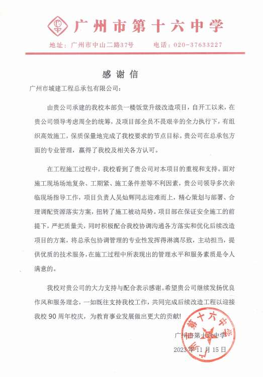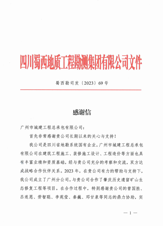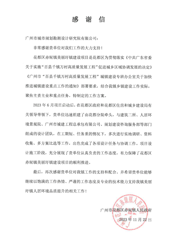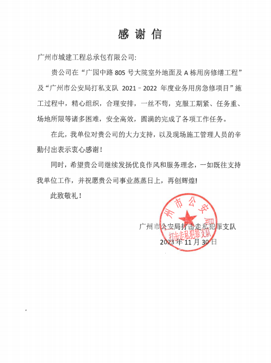 近期,公司陸續(xù)收到多個項目業(yè)主和配合單位發(fā)來的感謝信,黃埔區(qū)文沖街道辦-瑞東花園社區(qū)品質(zhì)提升項目、十六中學(xué)-校本部飯?zhí)酶脑祉椖?、花都赤坭?zhèn)政府-美麗圩鎮(zhèn)全過程咨詢項目、廣州市公安局打私隊-廣園中路805號大院室外地面及A棟用房修繕工程、廣州市公安局打私支隊2021-2022年度業(yè)務(wù)用房急修項目、四川蜀西地勘集團-肇慶歷史遺留礦山生態(tài)修復(fù)工程等參建單位對公司和項目參與成員所付出的工作表示肯定和感謝。對公司的項目團隊發(fā)揮不怕疲勞、持續(xù)作戰(zhàn)的職業(yè)精神,在高強度駐場工作中表現(xiàn)出的高度工作熱情、強烈工作責(zé)任心、扎實專業(yè)素養(yǎng)和嚴謹細致的工作態(tài)度給予贊揚。
